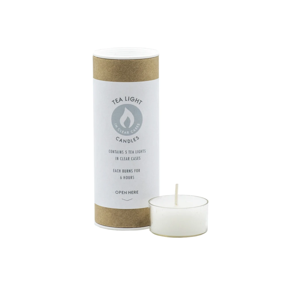 BEEING offers tubes of 5 tealights in clear cases (scented or non-scented), each lasting roughly 6 hours.