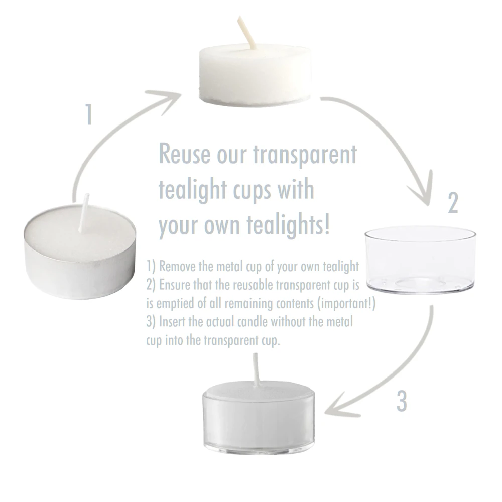 As the clear cases are reusable with any 4h or 6h candles, use your own tealights in them!